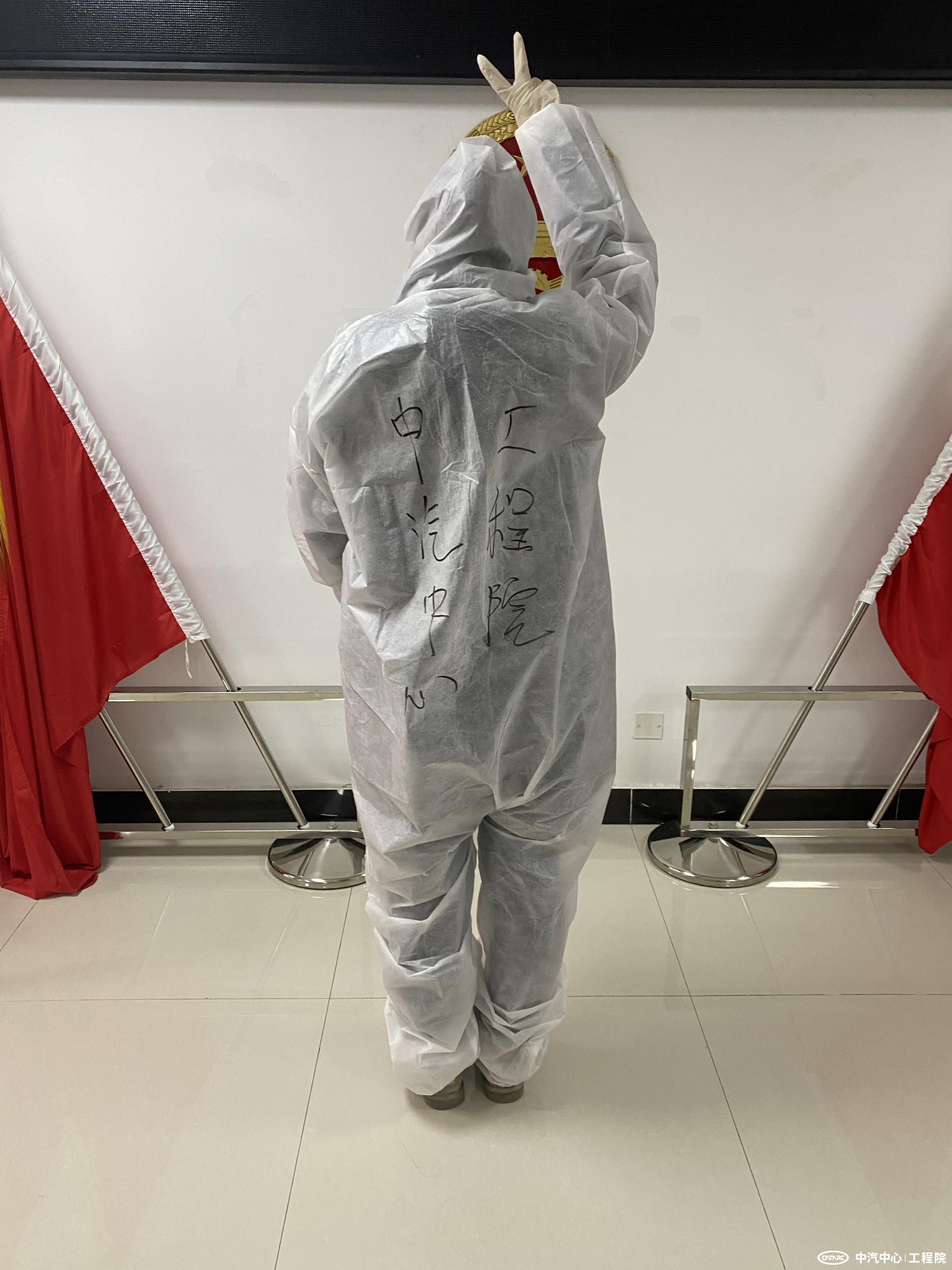 圖-于海躍已于2021年12月成為入黨積極分子,完成服務(wù)后她在防護(hù)服上寫下了“中汽中心工程院”的字樣