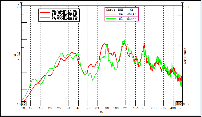 路面一致性良好。粗糙砂石轂面構造深度約3.5mm,粒徑6~8mm,測試結果可完美復現實際路面噪聲,幅值、頻譜高度相似,并且在長時間、多次數的測試中表現出了良好的重復性。穩定的路面激勵源對平臺車型的路噪性能研發驗證工作也有重要意義。