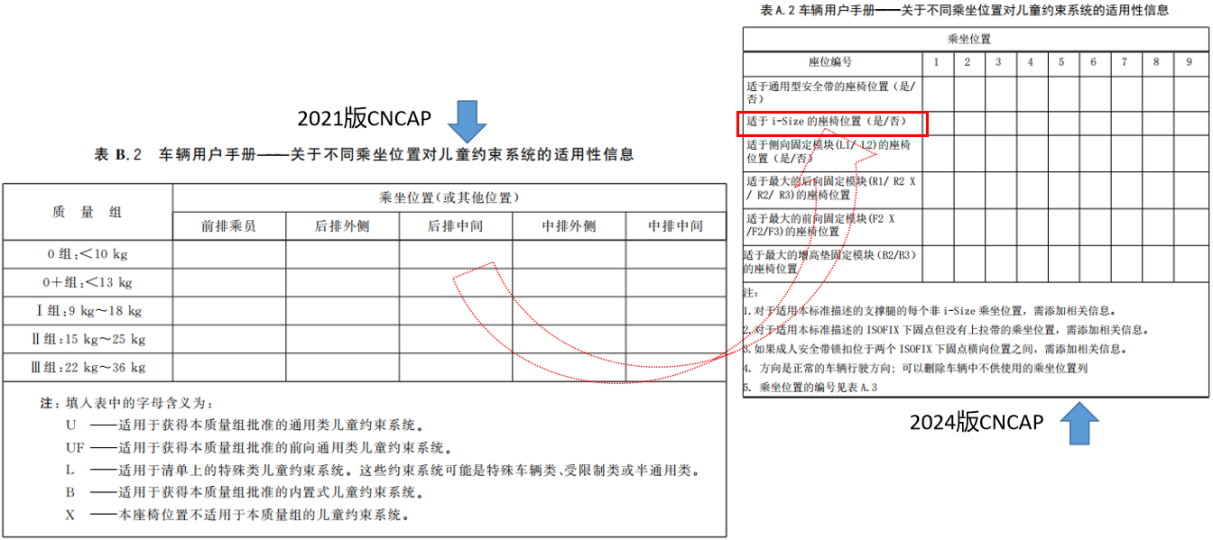 2024版C-NCAP增加了I-SIZE位置的評價,對車輛本身座椅的性能要求提升,相應的I-SIZE兒童座椅型號及標識評價需要相繼規劃,在 GB 14167-202X 實施日期之前,仍按C-NCAP2021 版中“ISOFIX 兒童約束系統適用性”執行;在 GB14167-202X 過渡期期間(預計24個月),可由企業選擇按本條款執行或仍按 CNCAP 2021 版中“ISOFIX 兒童約束系統適用性” 執行;在 GB 14167-202X 過渡期后(預計實施日起第 25 個月),按GB 14167-202X條款執行。