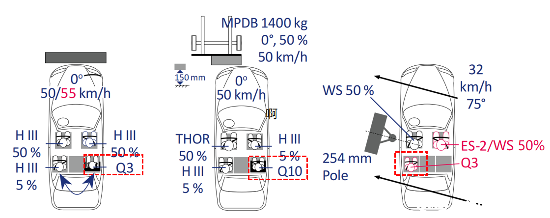 • 側柱碰對Q3假人進行評價,其安裝方式與正碰有相關性,影響正碰兒童座椅安裝朝向的選擇以及評價指標的選擇,這就需要關注正碰和側柱碰的相容性問題。