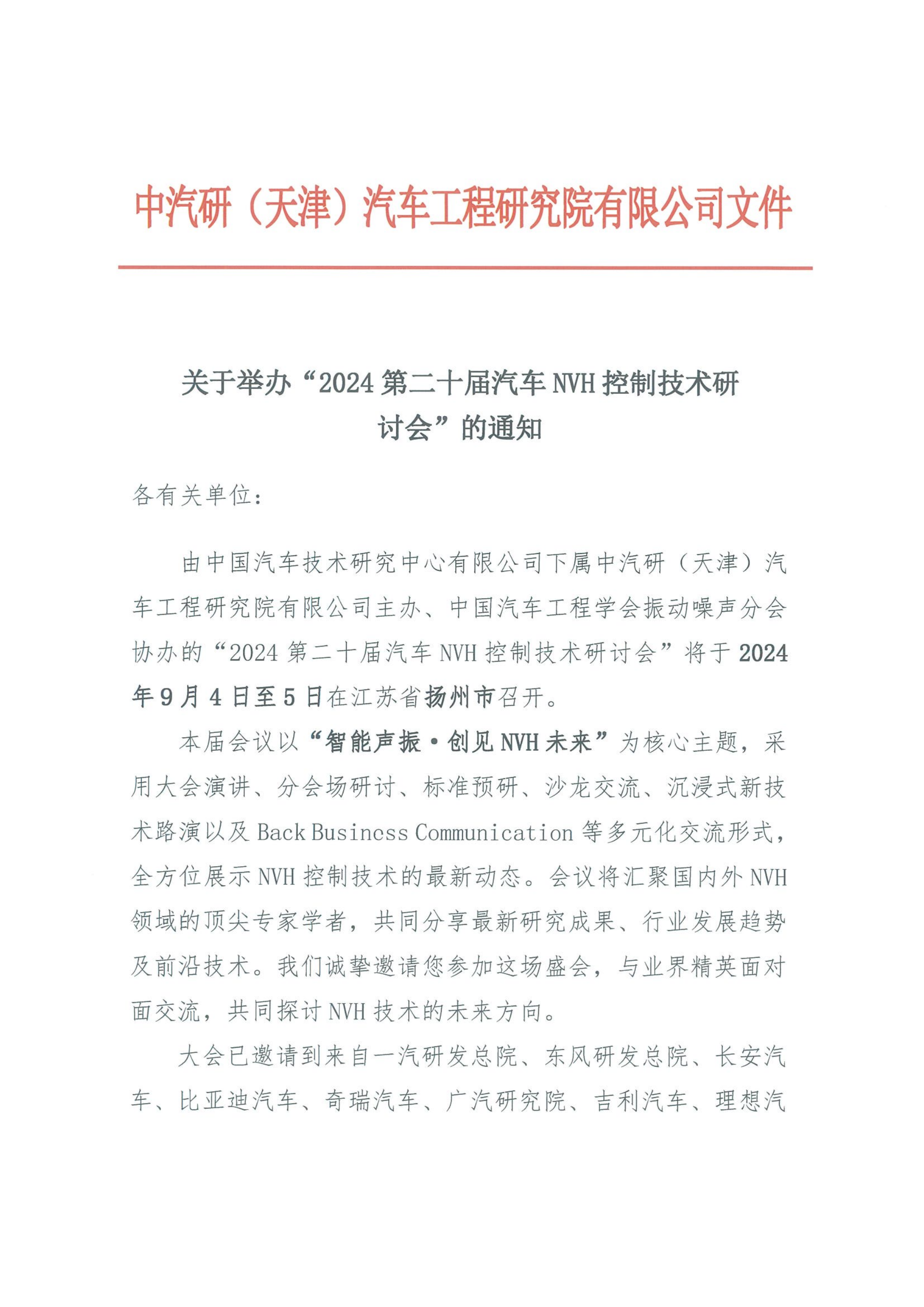 關(guān)于舉辦“2024第二十屆汽車NVH控制技術(shù)研討會(huì)”的通知