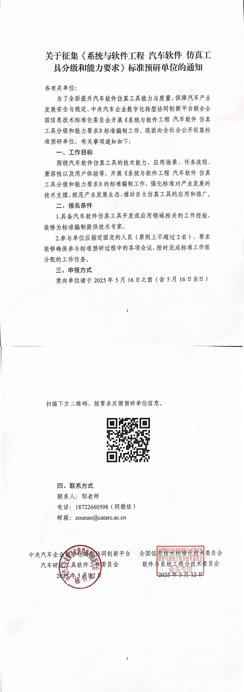 關(guān)于征集《系統(tǒng)與軟件工程 汽車軟件 仿真工具分級(jí)和能力要求》標(biāo)準(zhǔn)預(yù)研單位的通知