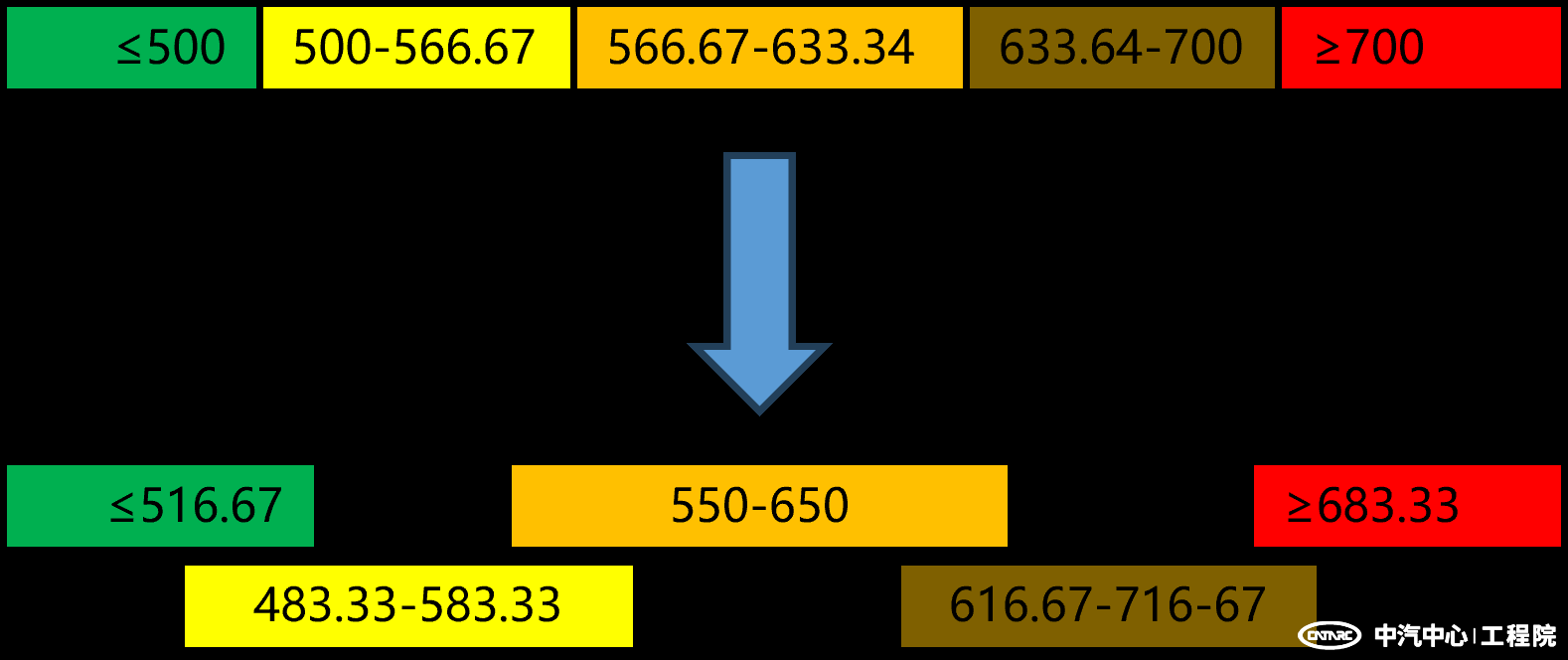 1. 得分計算由線性插值變為色帶評分。假人傷害評價區間按高、低限值三等分,得分色帶分別為綠色、黃色、橙色、棕色、紅色,對應的得分比例分別為100%、80%、40%、20%、0%,得分比例基于假人身體部位的最高得分。