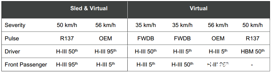 主要變化:正碰乘員多樣性通過滑臺試驗結合虛擬測評進行測試,并首次引入HBM人體模型進行虛擬測評監測,乘員多樣性考察35km/h,50 km/h,56 km/h三種不同碰撞速度下假人傷害,使用 HIII 05F、50M、95M三款假人進行乘員多樣性虛擬測評。