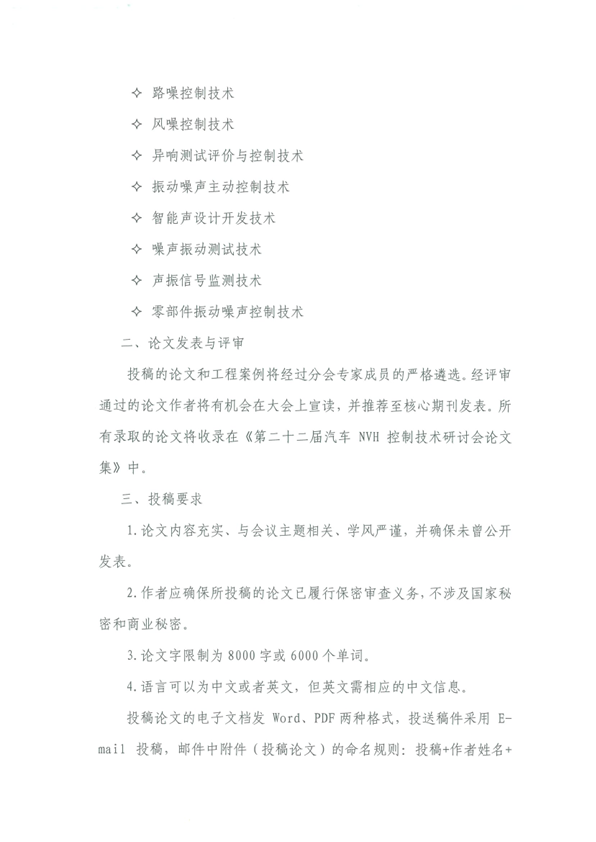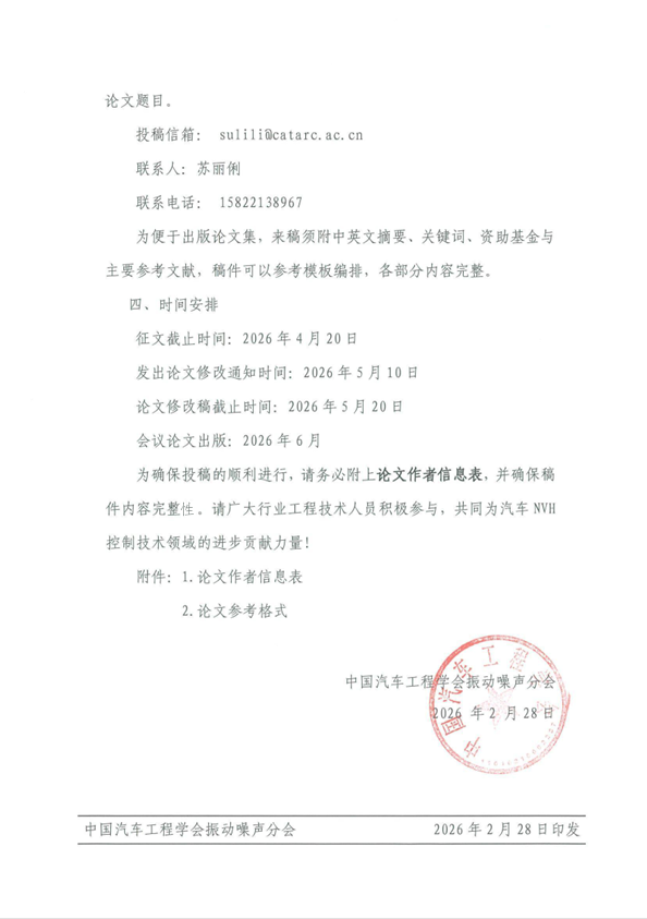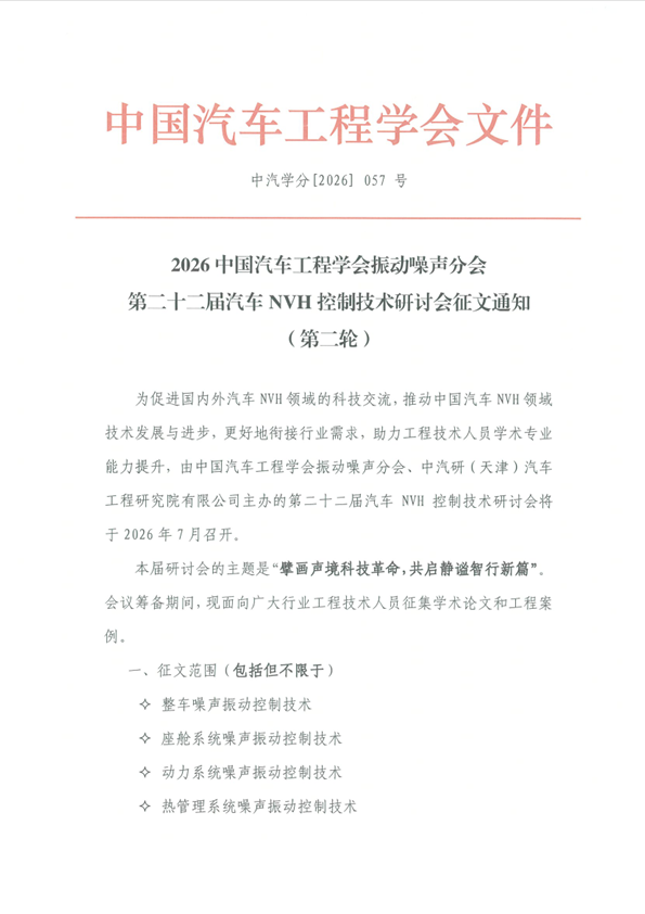 2026中國(guó)汽車工程學(xué)會(huì)振動(dòng)噪聲分會(huì) 第二十二屆汽車NVH控制技術(shù)研討會(huì)征文啟事 (第二輪)